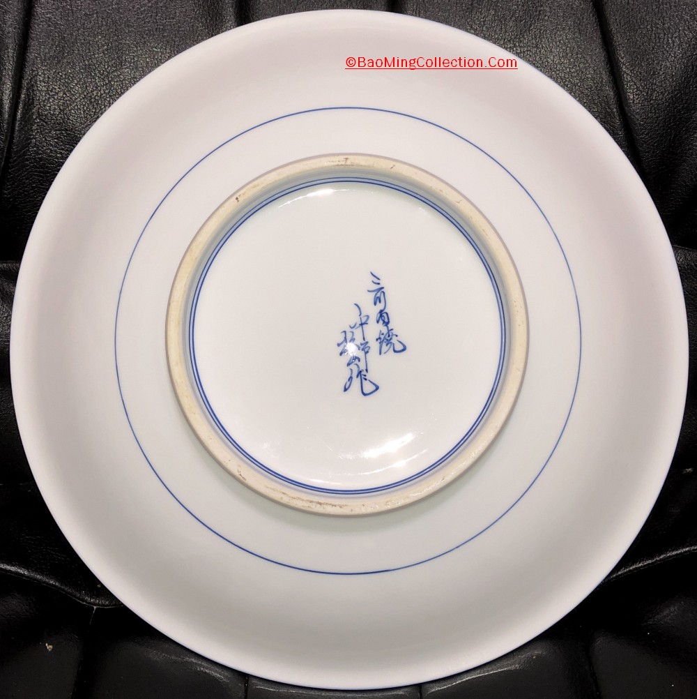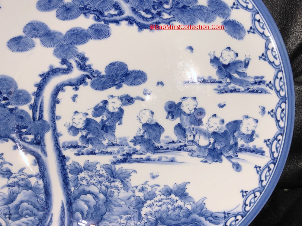 Personal Collection. Item is not for sale. Japanese Hirado ware blue and white porcelain charger decorated with "Seven Boys" frolicking around an old pine tree surrounded by peony and other flowers.