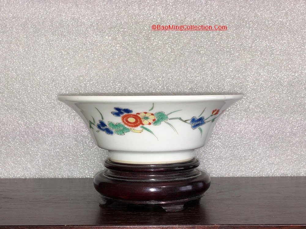 Set of 5 Japanese Kakiemon porcelain bowls with original antique wooden storage box. The bowls have flat bottom; they're used for eating sweet and snacks. Purchased from estate consignment auction from Jeffrey S. Evans in Virgina back in 2011. They're accompany by an hand written note, which indicates they were purchased in Japanese in 1965.