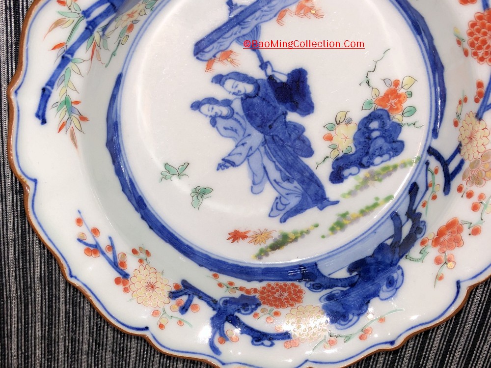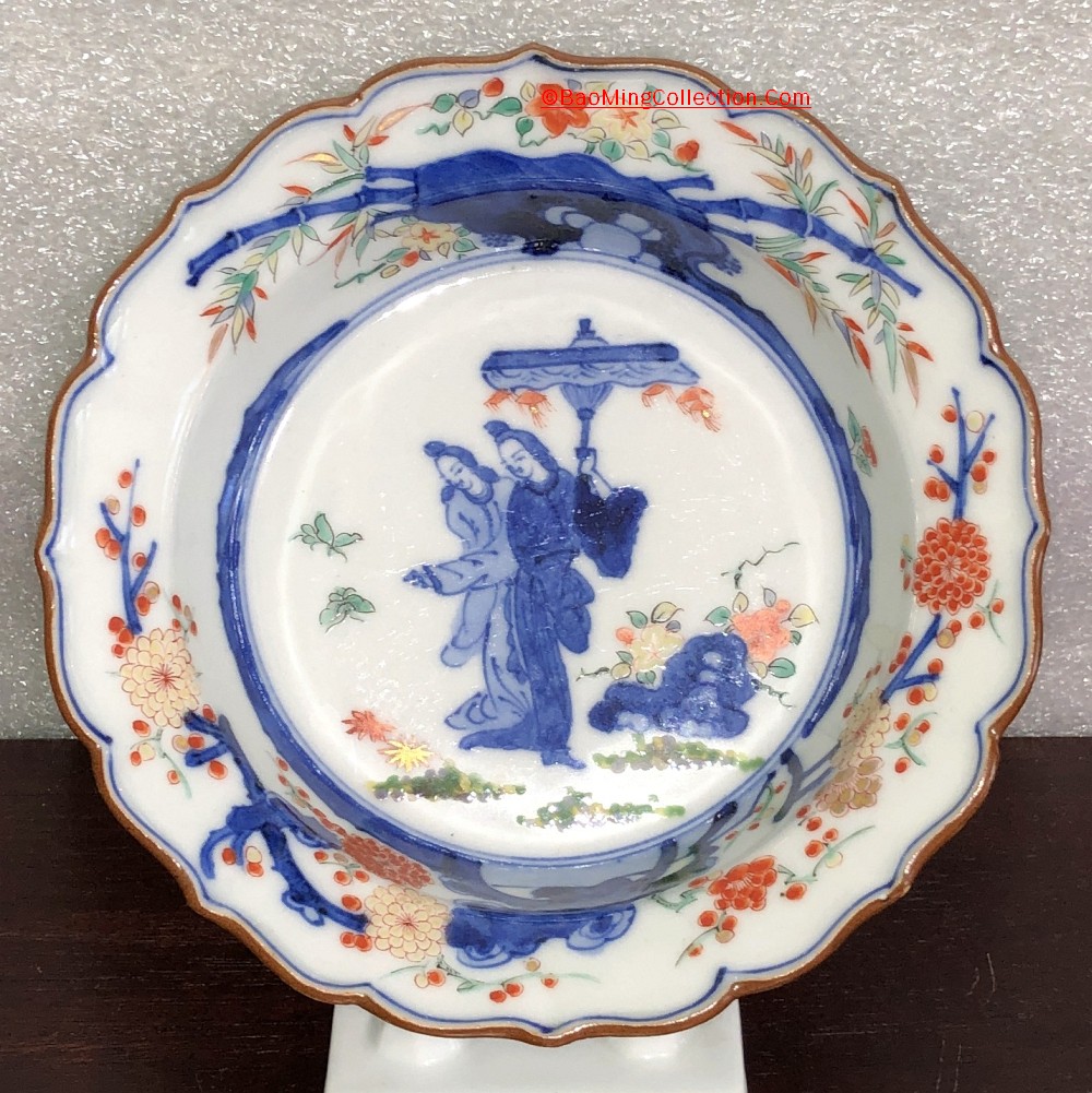 Personal Collection. Item is not for sale. Japanese Imari bowl with Kakiemon style decoration depicting Geisha Bijin with umbrella in garden.